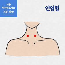 - 오른손 집게손가락과 가운뎃손가락을 나란히 모아서 가운뎃손가락이 오른쪽 인영혈에 닿도록 하고, 목 가운데 쪽으로 가볍게 눌러줍니다.
